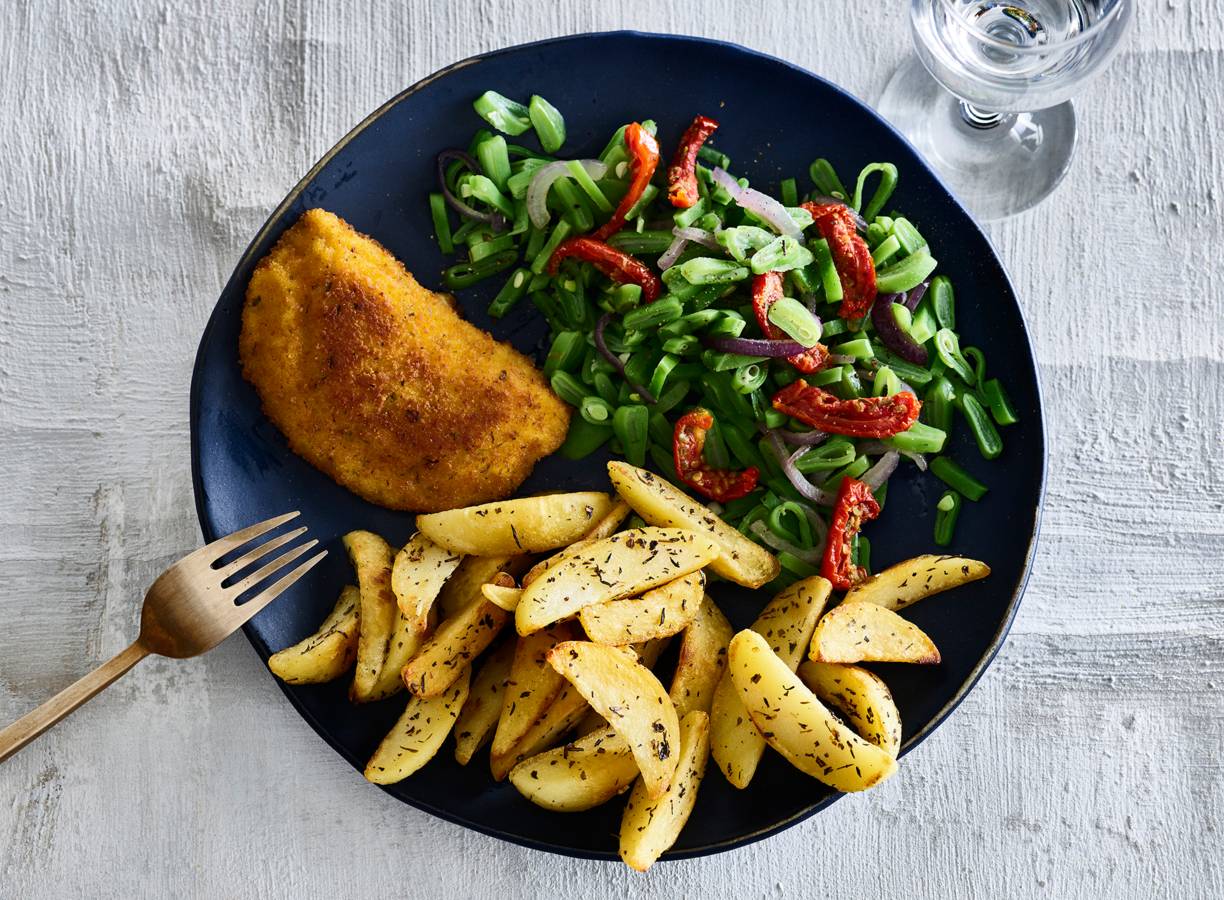 Kaasschnitzel met mediterrane aardappeltjes en snijbonen