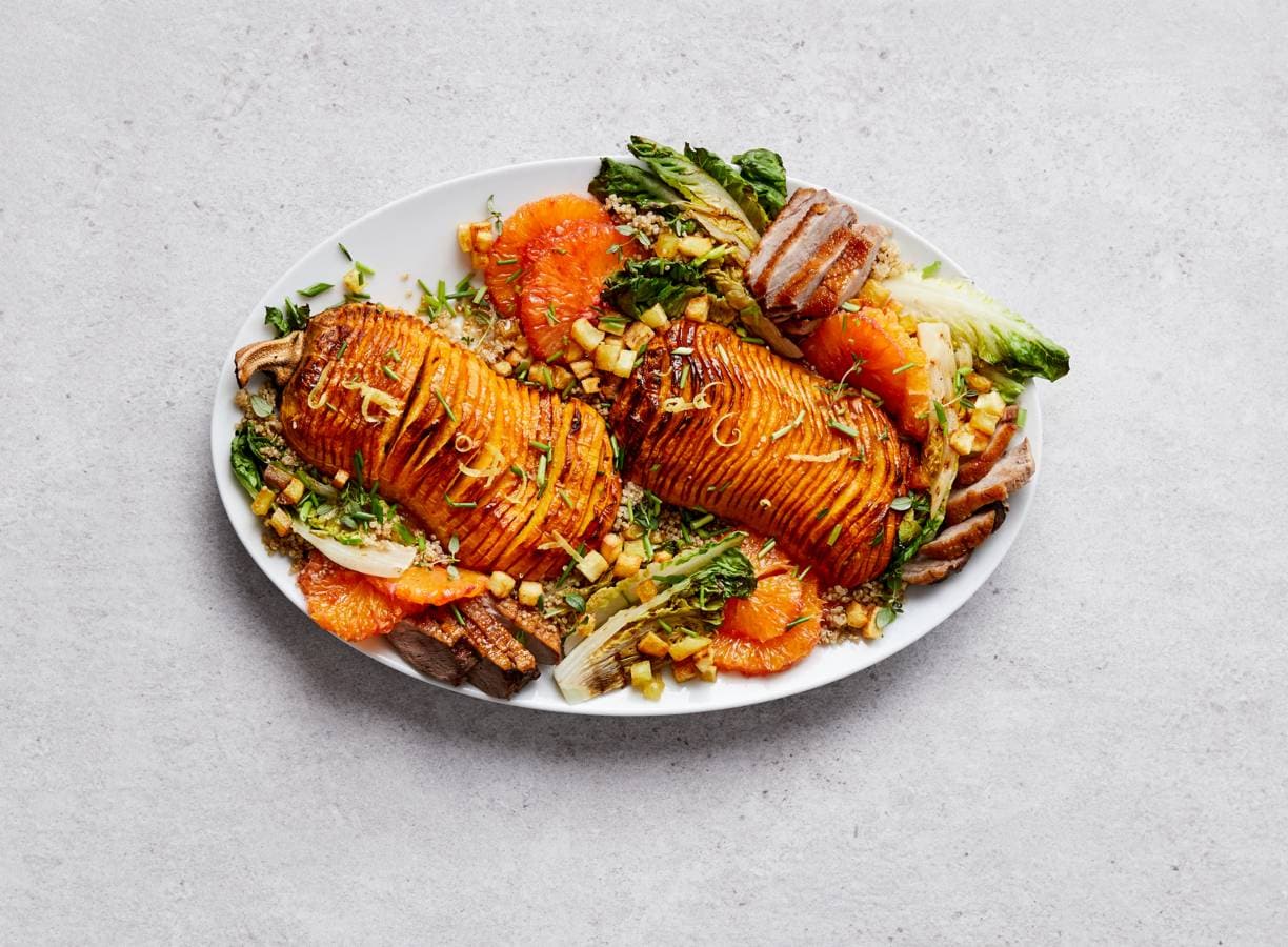 Hasselbackpompoen met sinaasappel, quinoa en aardappelkaantjes