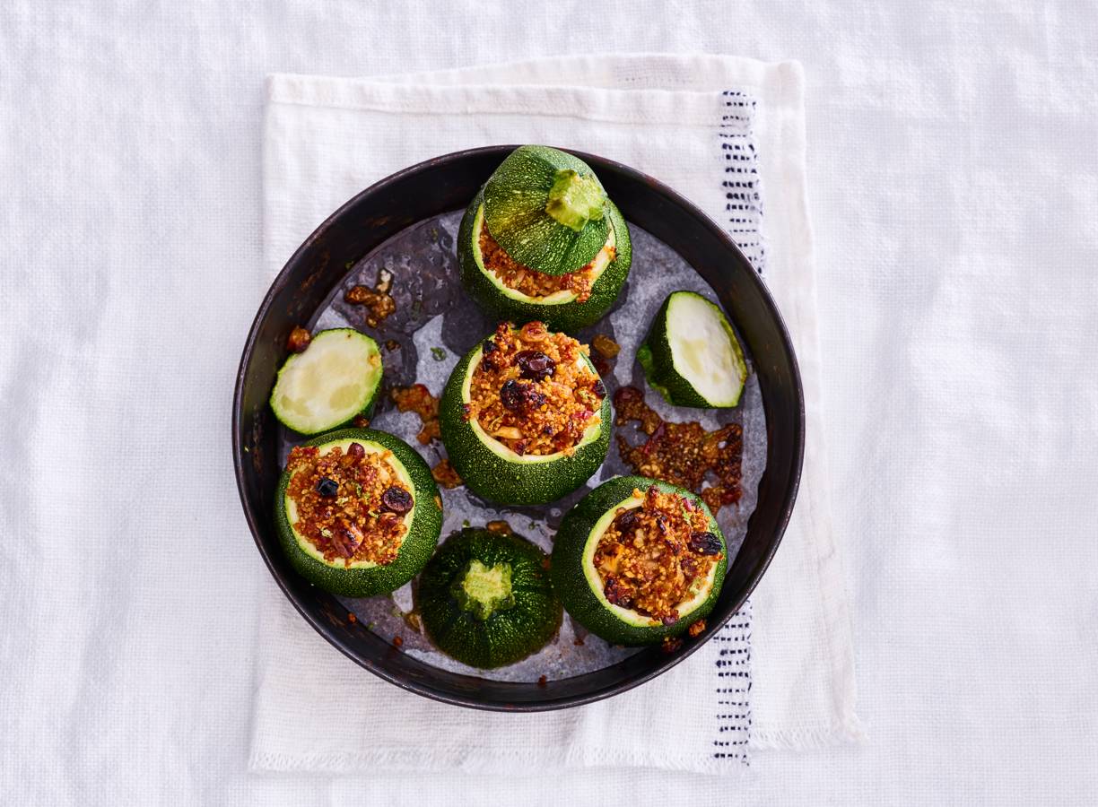 Vul de bolcourgettes met het mengsel en zet ze op een met bakpapier beklede bakplaat. Leg de kapjes ernaast. Bak de courgettes in ca. 25 min. gaar.