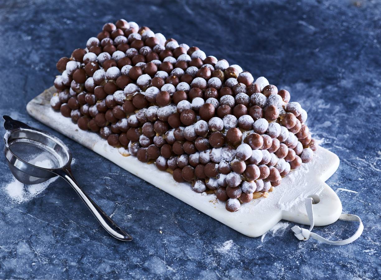 Leg de maltesers in schuine rijen op de cake. Zorg dat er tussen elke rij ca. 1 ½ cm ruimte zit zodat er later nog een rij maltesers tussen past. Bestrooi de rijen met poedersuiker. Leg daarna in alle open ruimten de rest van de maltesers.