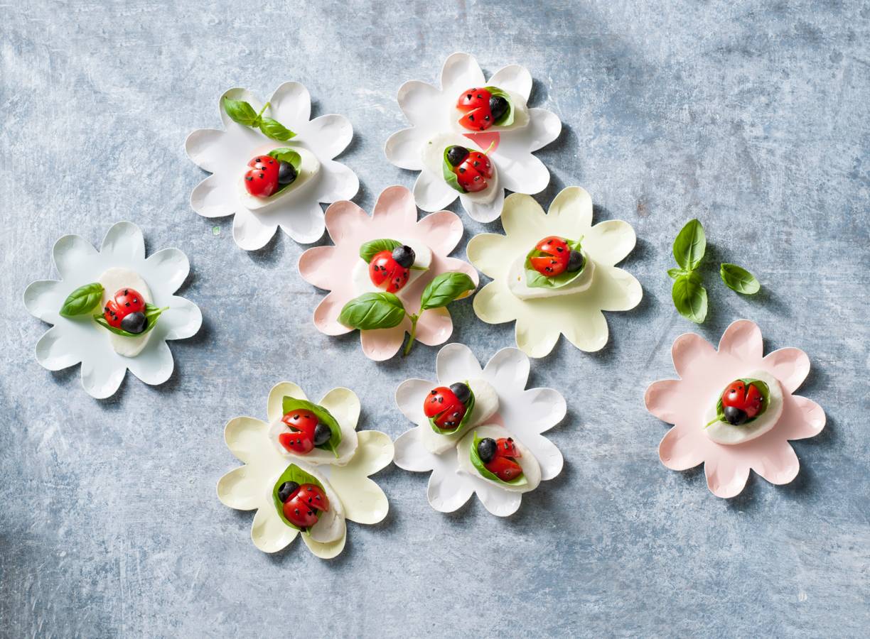 Snijd de mozzarella in plakjes van een ½ cm dik en leg ze op een grote, platte schaal. Leg op elk plakje een groot blaadje basilicum. Halveer de tomaten en snijd ze aan de bolle kant tot de helft in. Leg op elk blaadje basilicum een halve tomaat met de bolle kant omhoog. Duw de kanten aan weerszijden van de inkeping een beetje naar buiten. Dit zijn de vleugels van het lieveheersbeestje. Halveer de olijven in de breedte en snijd 2 olijven in piepkleine stukjes. Maak van elke halve olijf het hoofdje van het lieveheersbeestje door het aan de voorkant aan de tomaat vast te leggen, dus aan de andere kant dan de vleugels. Maak de stippels van het lieveheersbeestje door over elke tomaat een paar snippers olijf te verdelen.