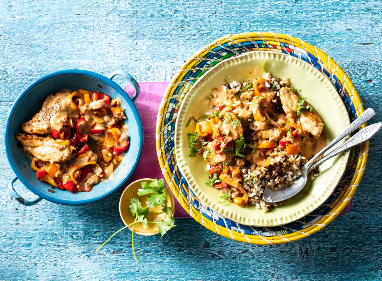 Kip in pindasaus met paprika & linzen-bloemkoolrijst