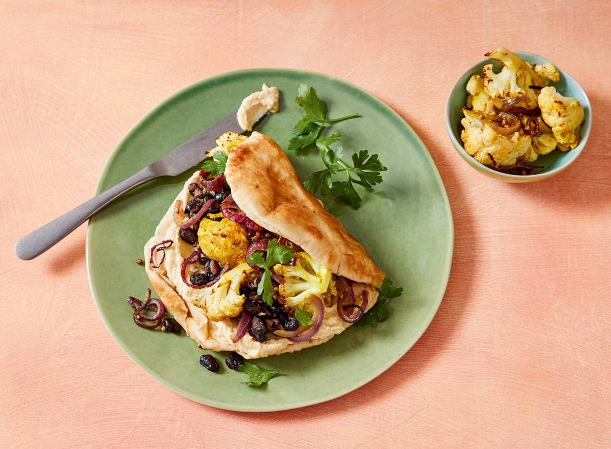Flatbreads met gebakken zwarte bonen, gekruide bloemkool en hummus