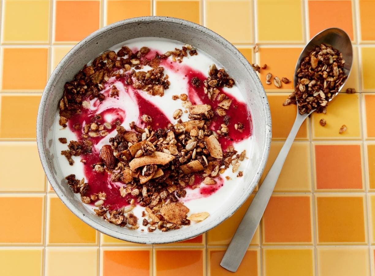 Pureer het zomerfruit met het vruchtensap in de blender of met een staafmixer. Verdeel de yoghurt over de kommen. Schep de fruitpuree in de kommen en maak met een lepel een mooie ‘swirl’. Verdeel de granola over de kommen.