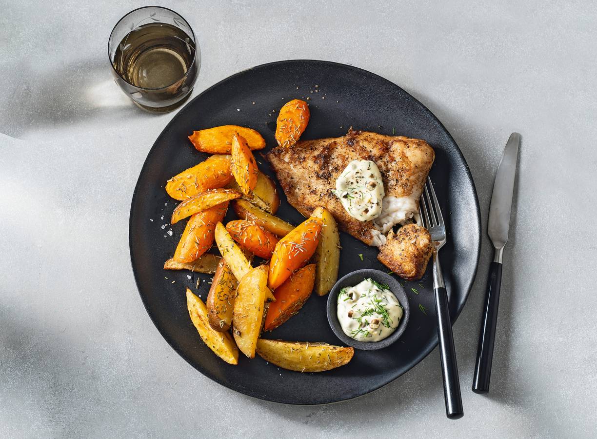 Witvis met kappertjesmayonaise, rozemarijnaardappelen & winterpeen
