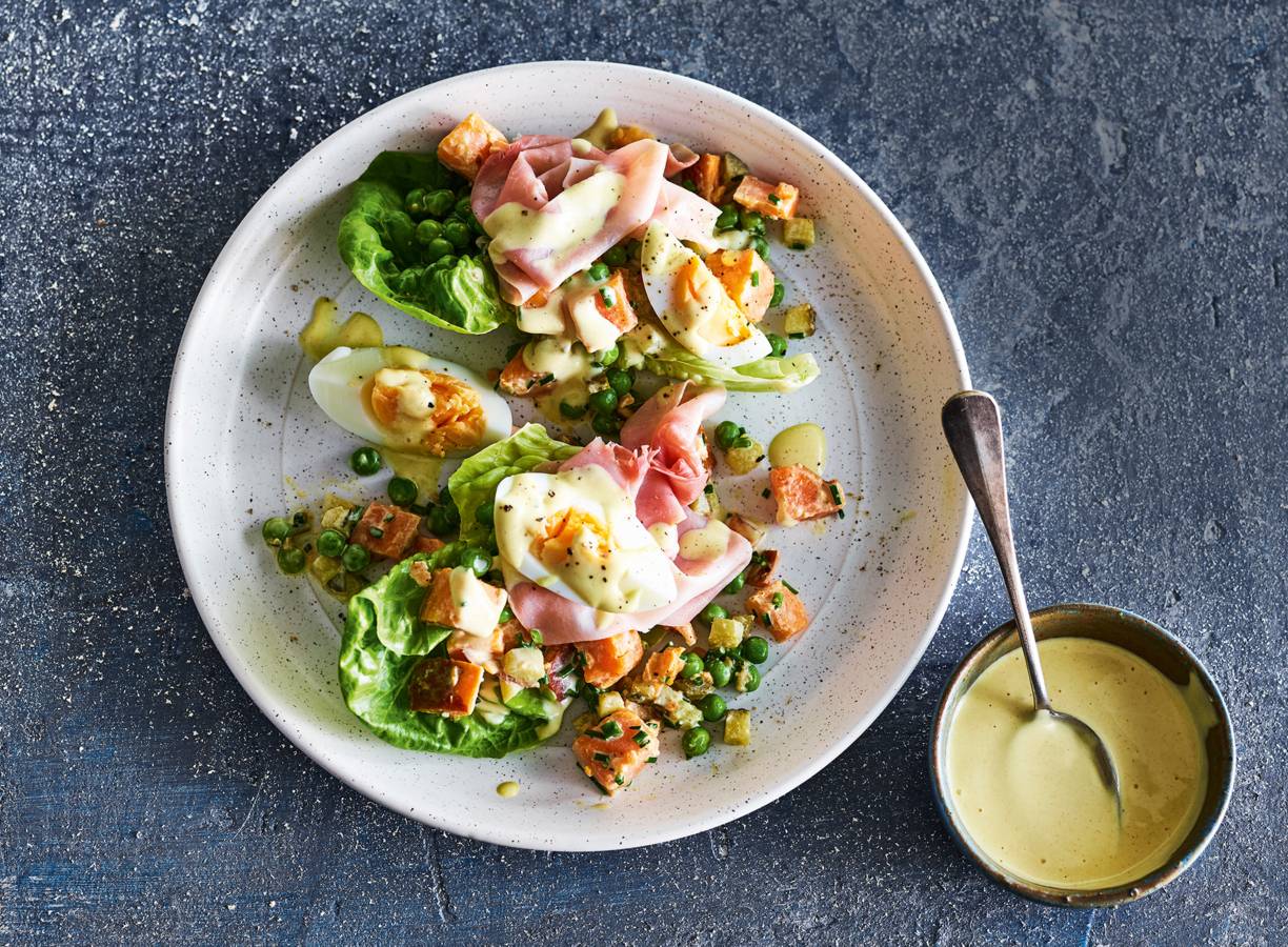 Haal de blaadjes van de sla los en verdeel over een schaal. Verdeel de huzarensalade, eiparten en gegrilde beenham erover.