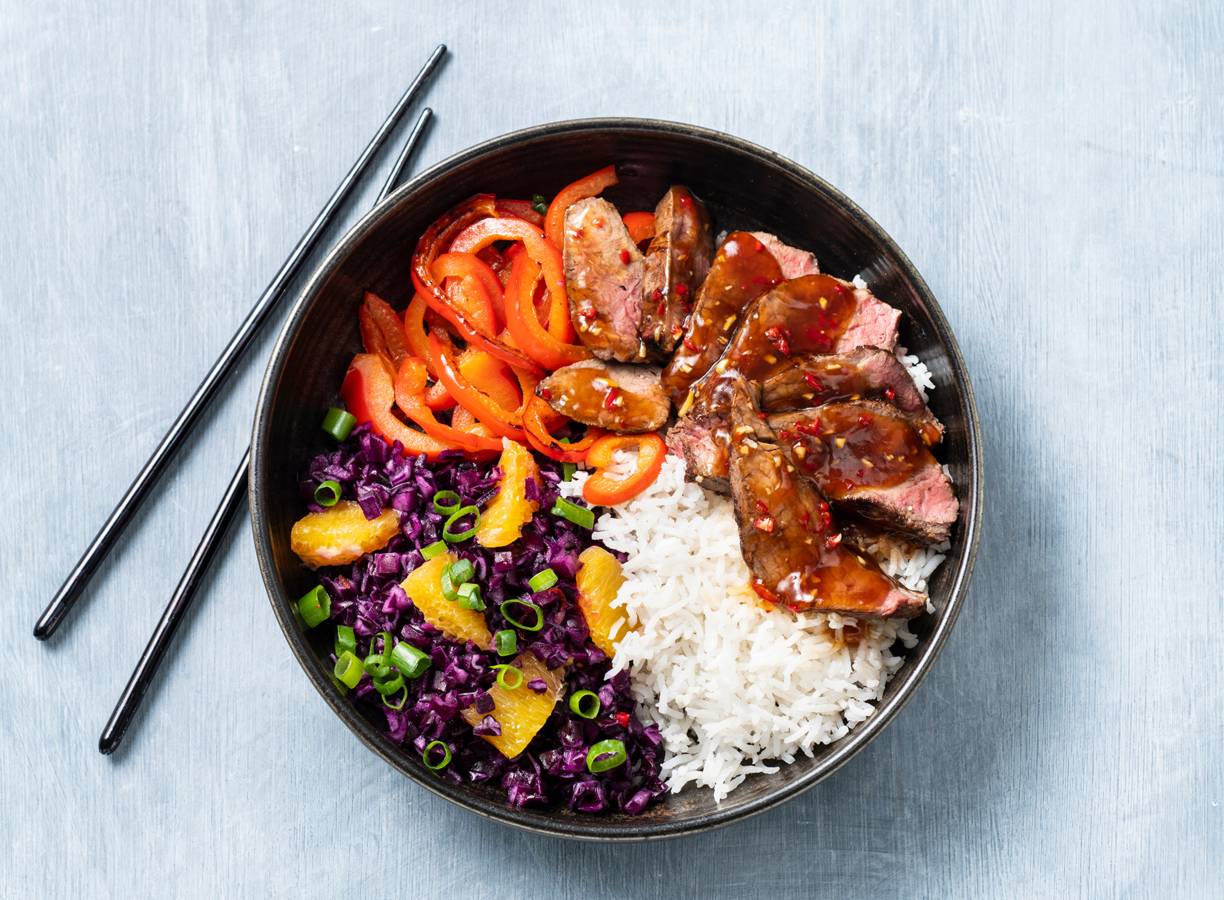 Pittige roerbak van biefstuk met rodekoolsalade & rijst