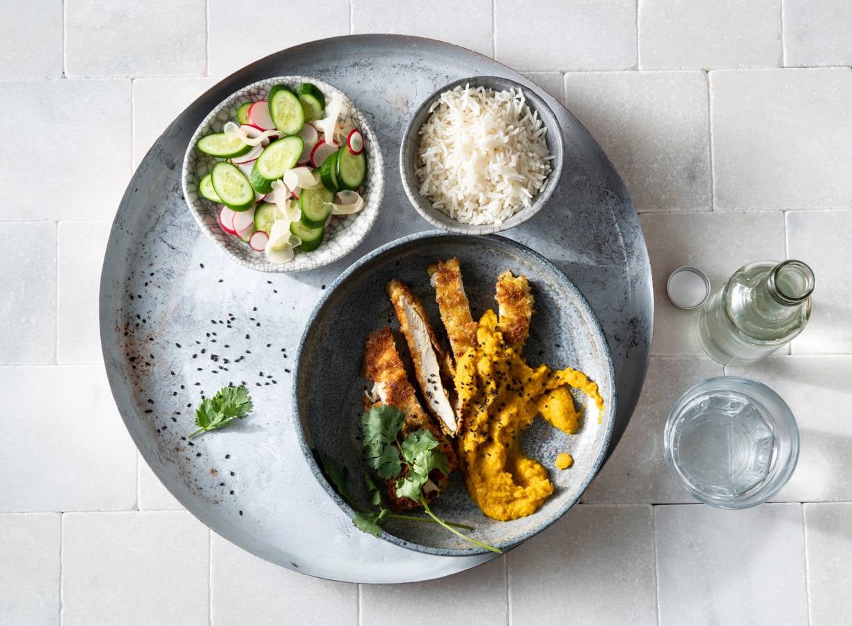 Doe de bloem met wat peper en zout in een diep bord en meng door elkaar. Klop het ei los in een ander diep bord en de panko in een derde diep bord. Wentel de kipfilets eerst door de bloem en schud het teveel aan bloem af. Haal vervolgens door het ei. Druk ze vervolgens stevig rondom in de panko.