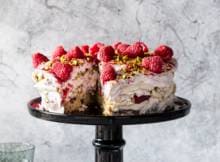 Verdeel vlak voor het serveren ⅓ van het mascarponemengsel over de cake. Dek af met een meringuecirkel. Herhaal dit en eindig met de rest van het mascarponemengsel. Bestrooi met de gehakte pistachenoten en achtergehouden verkruimelde gevriesdroogde frambozen en verdeel de verse hele frambozen erover.