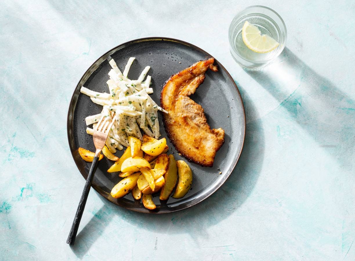 Verhit de rest van de olie in een koekenpan met antiaanbaklaag en bak de speklapjes in 5 min. goudbruin en gaar. Serveer met de aardappelpartjes en selleriesalade.