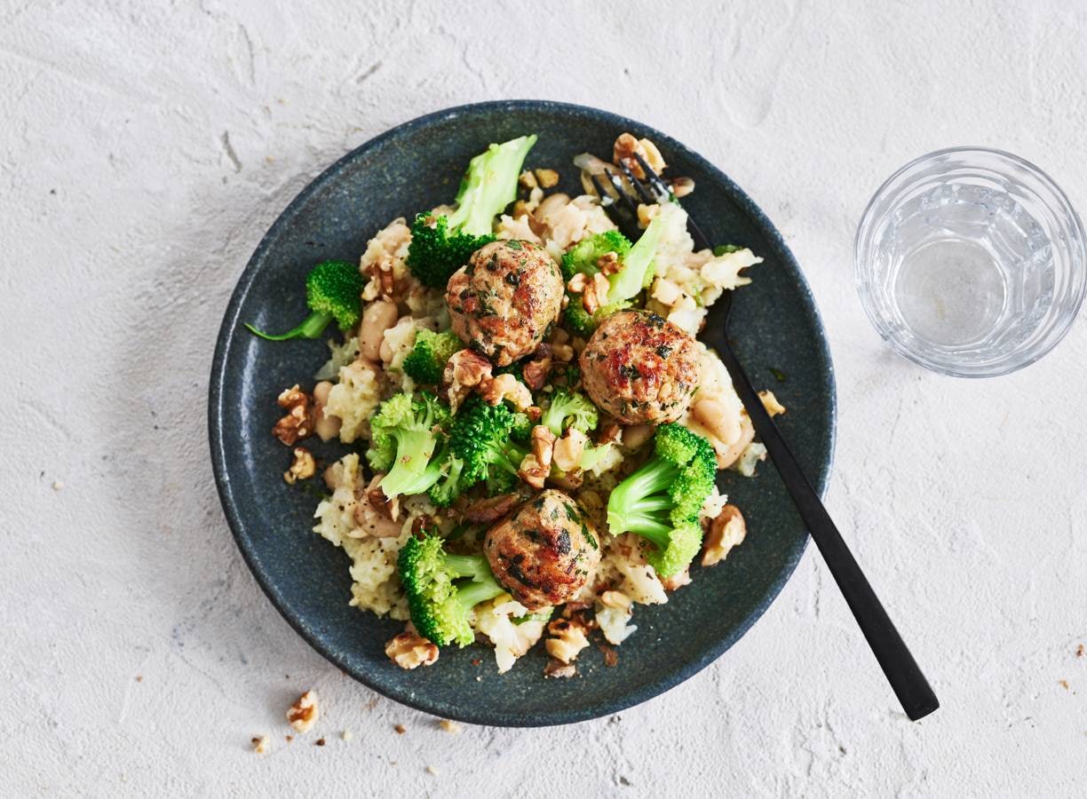 Verdeel de bloemkoolpuree over de borden en verdeel de broccoli-roosjes en gehaktballetjes erover. Bestrooi het gerecht met de walnoten.