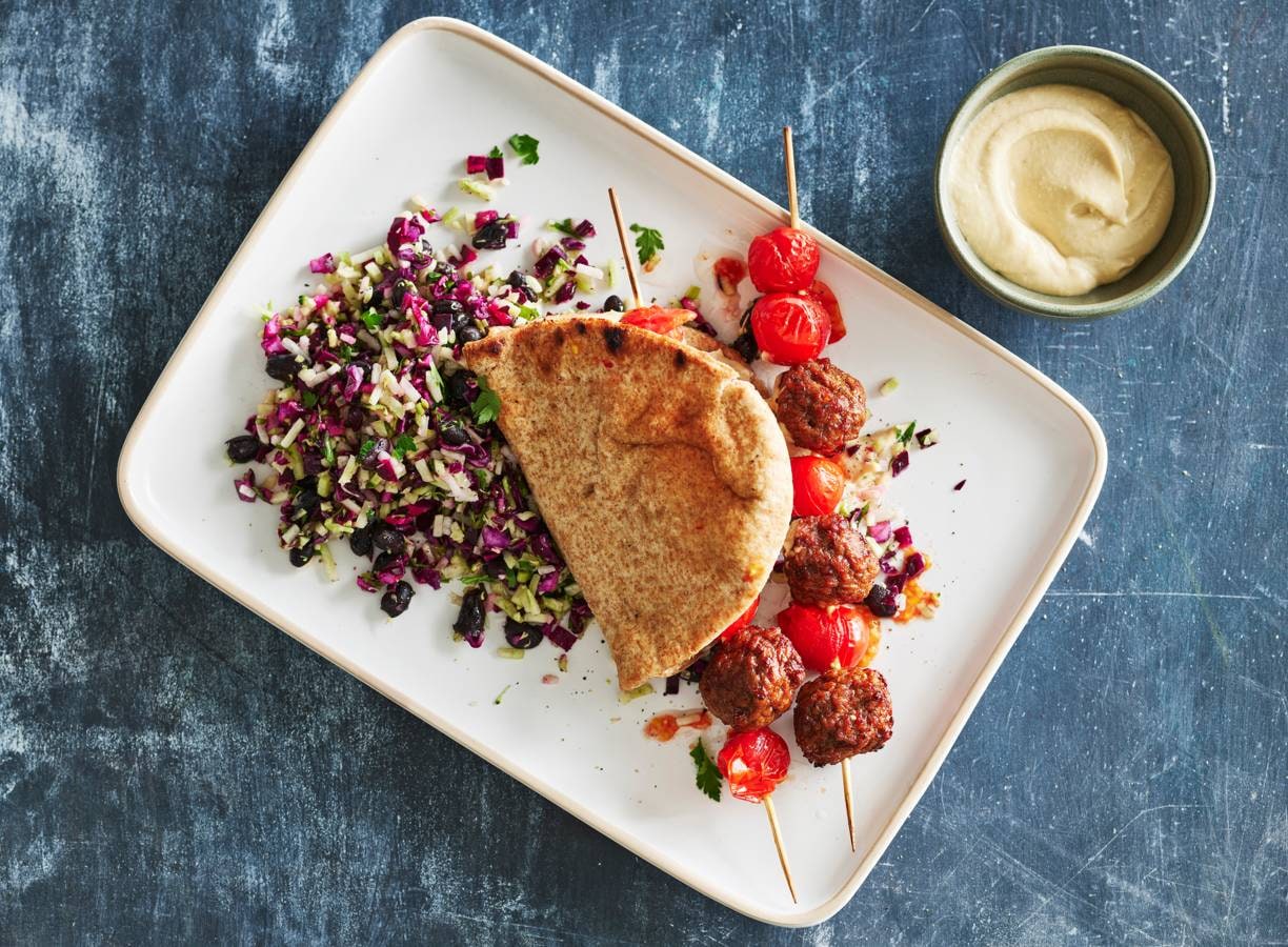 Besmeer elke flatbread met 1 el hummus en serveer met de spiesjes, salade en de rest van de hummus.