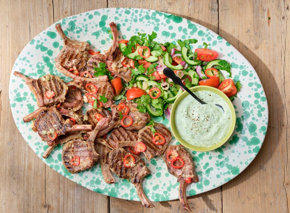 Meng de salade met de rest van de marinade en breng op smaak met peper en eventueel zout. Verdeel samen met de lauwwarme gemarineerde lamskoteletten over een grote schaal.