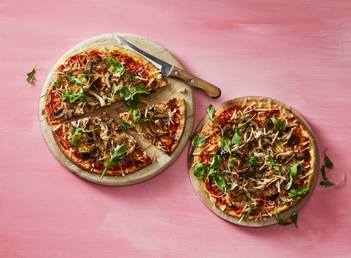 Pizza party met deze vegan pizza funghi! De truffelolie maakt het feestje af.