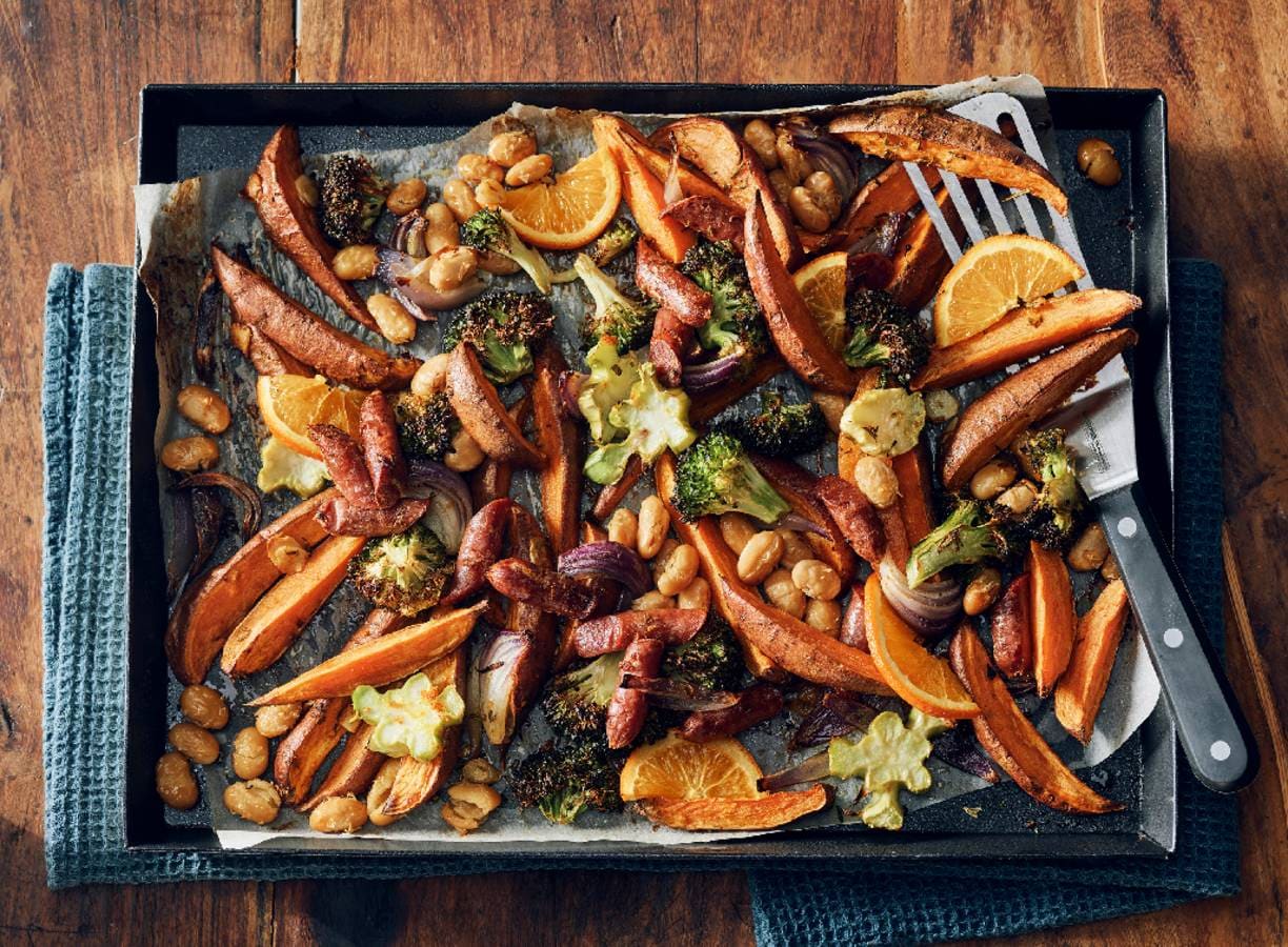 Verdeel de plakjes sinaasappel, de bonen, zoete aardappel, broccoli, ui en stukjes fuet over een met bakpapier beklede bakplaat en meng met het olie-sinaasappelmengsel. Bak ca. 30 min. in het midden van de oven tot de groenten zijn geroosterd en bruin zijn aan de randjes. Schep halverwege om.