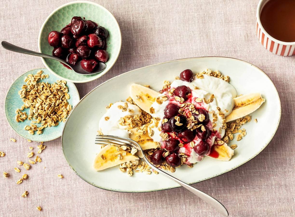Halveer ondertussen de bananen overlangs en leg de helften op een bord. Schep de kwark erop. Verdeel de kersen erover en bestrooi met de muesli.