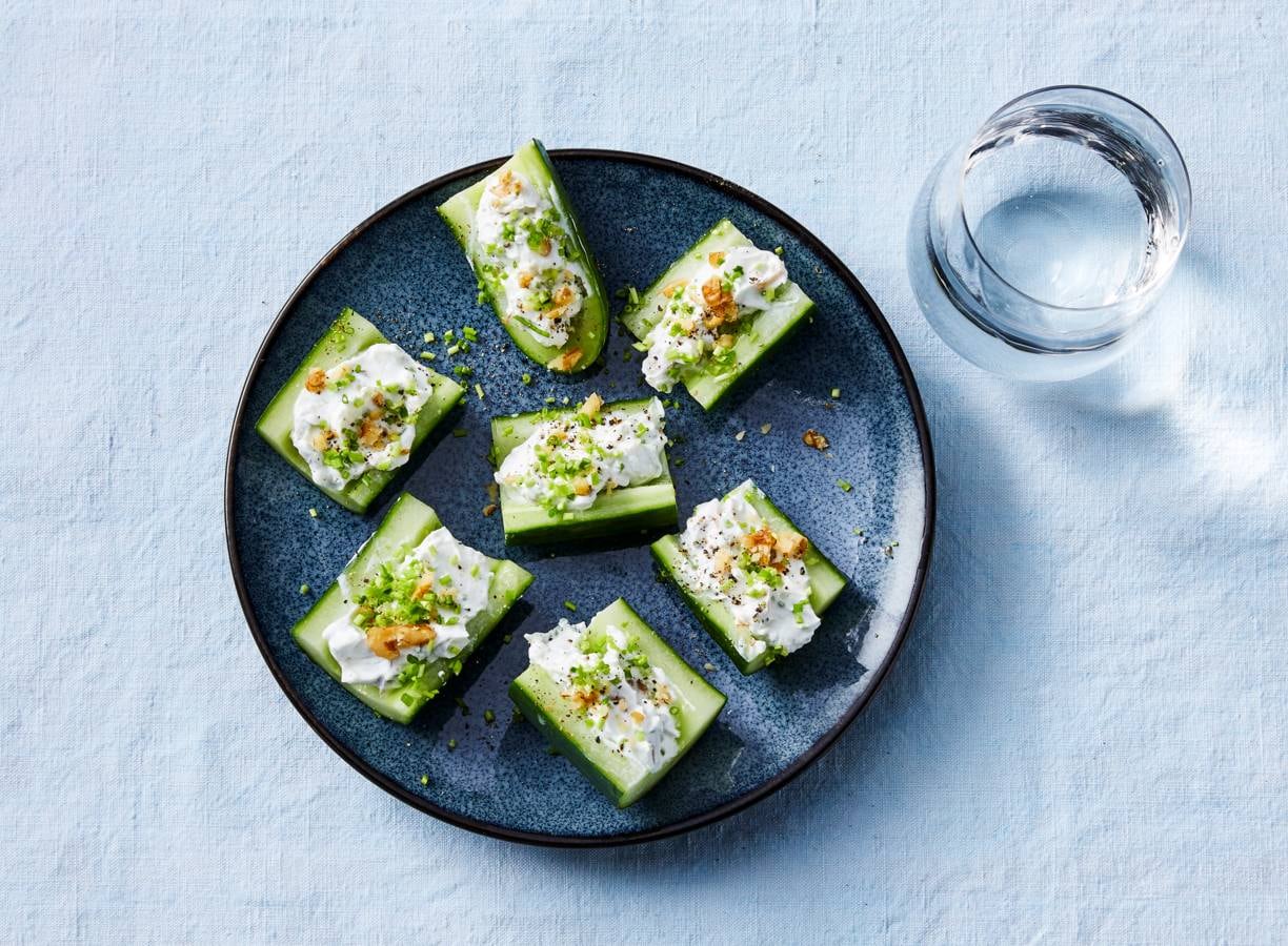 Hak de walnoten fijn en snijd de bieslook fijn. Meng de walnoten, ⅔ van de bieslook en wat peper door de geitenkaas. Vul de komkommerstukken met de noten-geitenkaasspread en bestrooi met de rest van de bieslook.