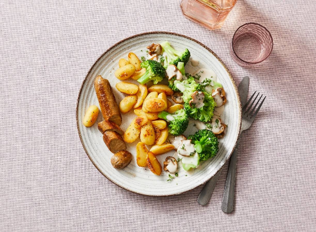 Gebakken krieltjes met broccoli en vegetarische bratwurst