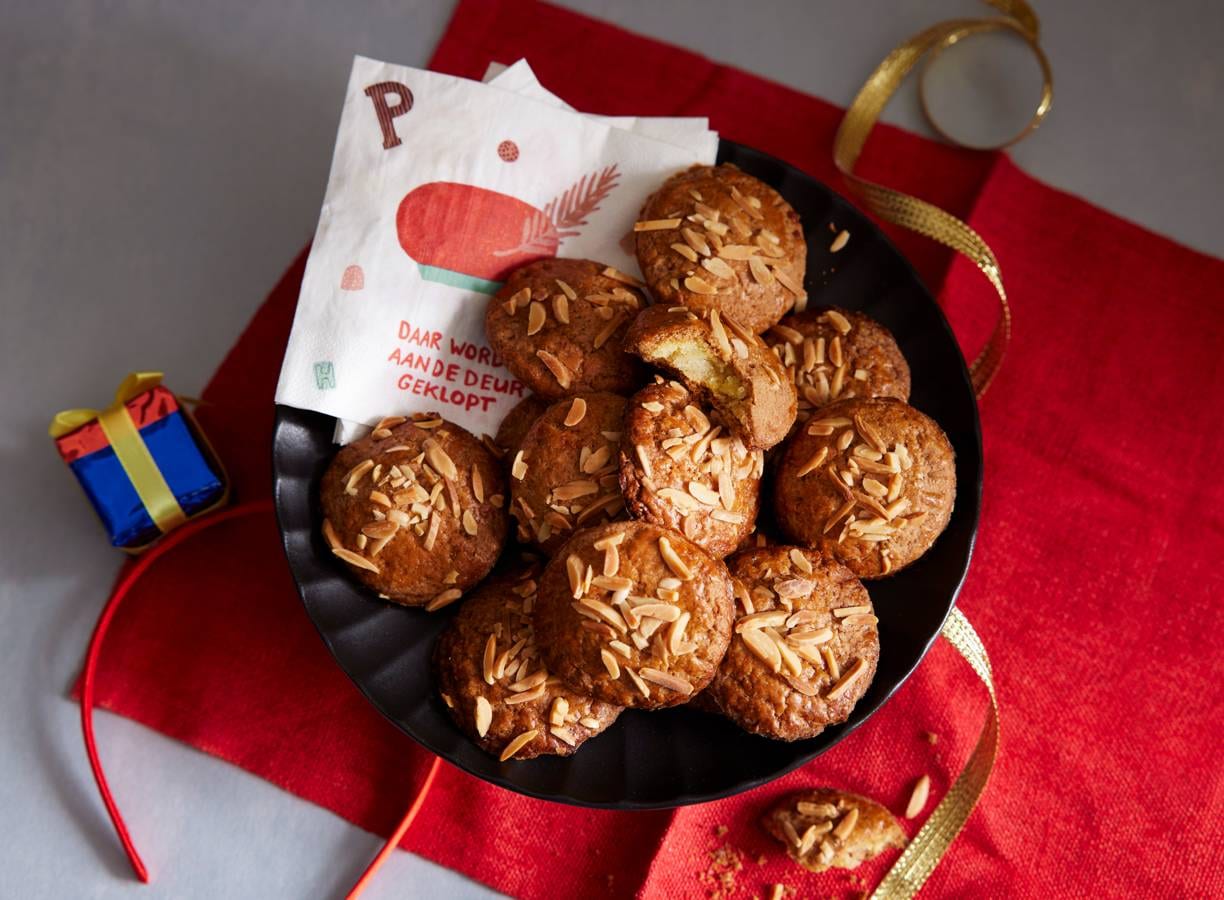 Bestrijk de bovenkant van het deeg met de rest van het ei en druk op elke gevulde koek wat amandelstiften in het midden van het deeg. Bak de gevulde koeken in ca. 20 min. goudbruin in het midden van de oven. Laat 10 min. afkoelen op een rooster.