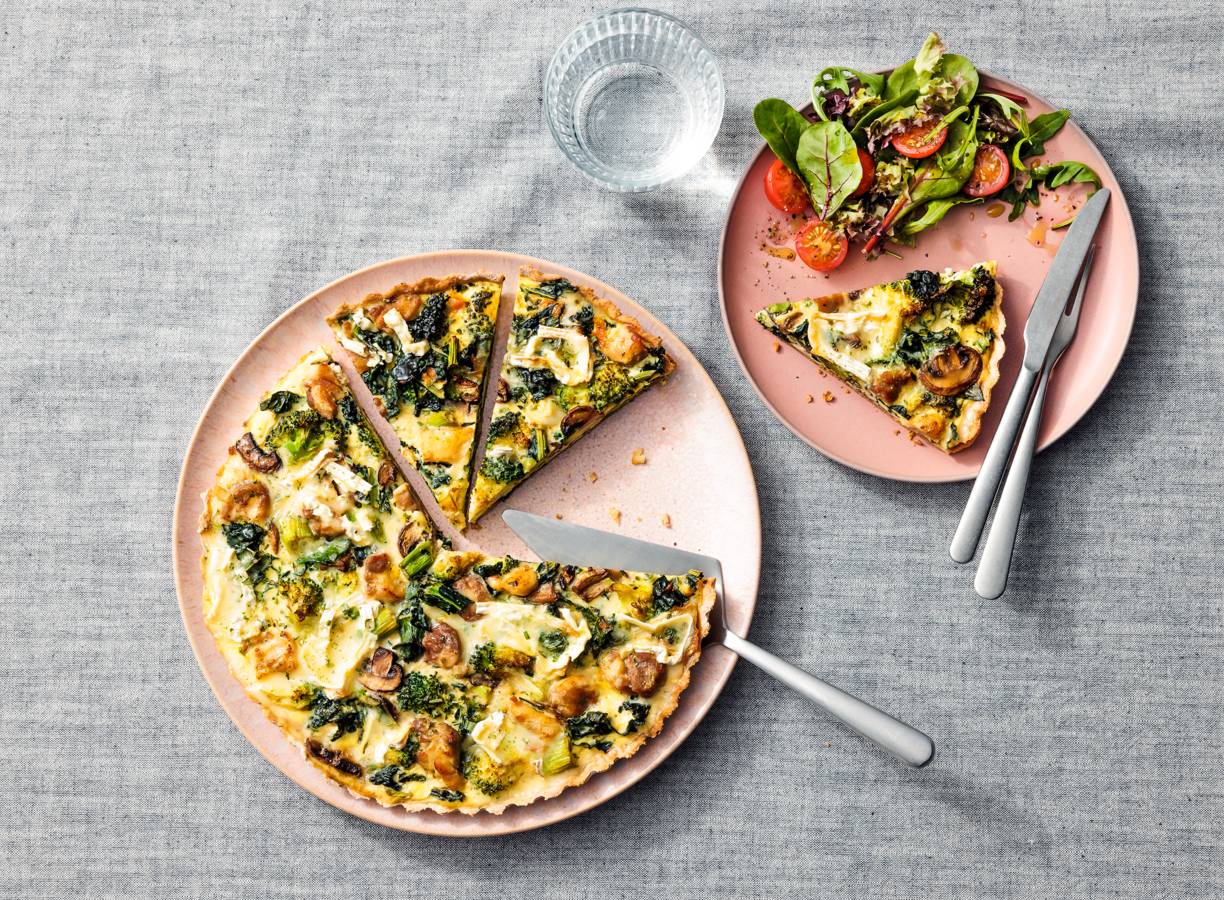 Volkoren quiche met kipdij, Italiaanse roerbakgroente Cavolo Nero en camembert