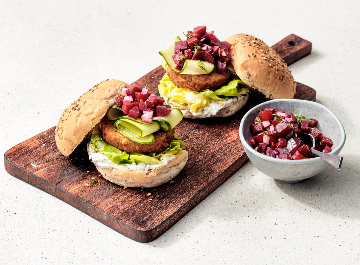 Besmeer de onderkant van de broodjes met de zuivelspread en beleg met de sla, zalmburger, komkommerlinten en 1-2 el bietensalade. Serveer de rest van de bietensalade erbij.