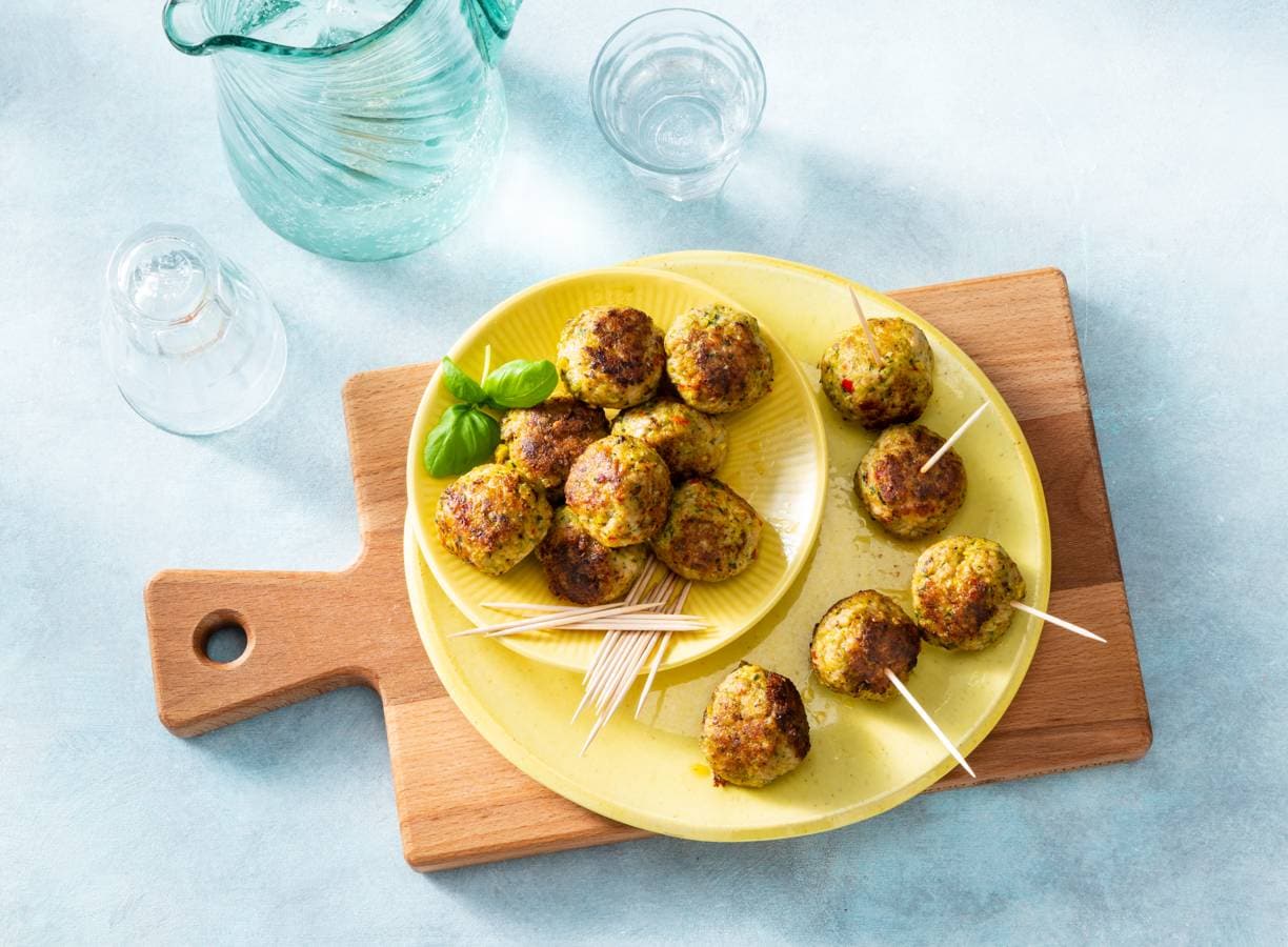 Een gezond borrelhapje in 20 min. op tafel? Deze kipgehaktballetjes zitten boordevol smaak door de zelfgemaakte pesto van pistachenoten!