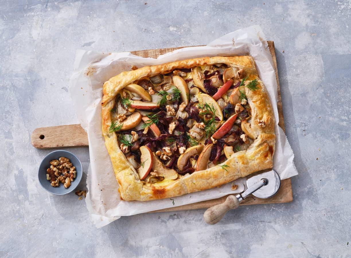 Snijd de ongeschilde appel in kwarten, verwijder het klokhuis en snijd het vruchtvlees in dunne plakjes. Leg het bladerdeeg op een met bakpapier beklede bakplaat, laat de randen iets overhangen en prik de deegbodem in met een vork. Splits ⅓ van de eieren. Meng het eiwit en de andere eieren met de verse kaas en verdeel over het midden van het deeg. Verdeel het witlofmengsel erover en vervolgens de plakjes appel. Vouw de deegrandjes om en bestrijk de randen met het eigeel.