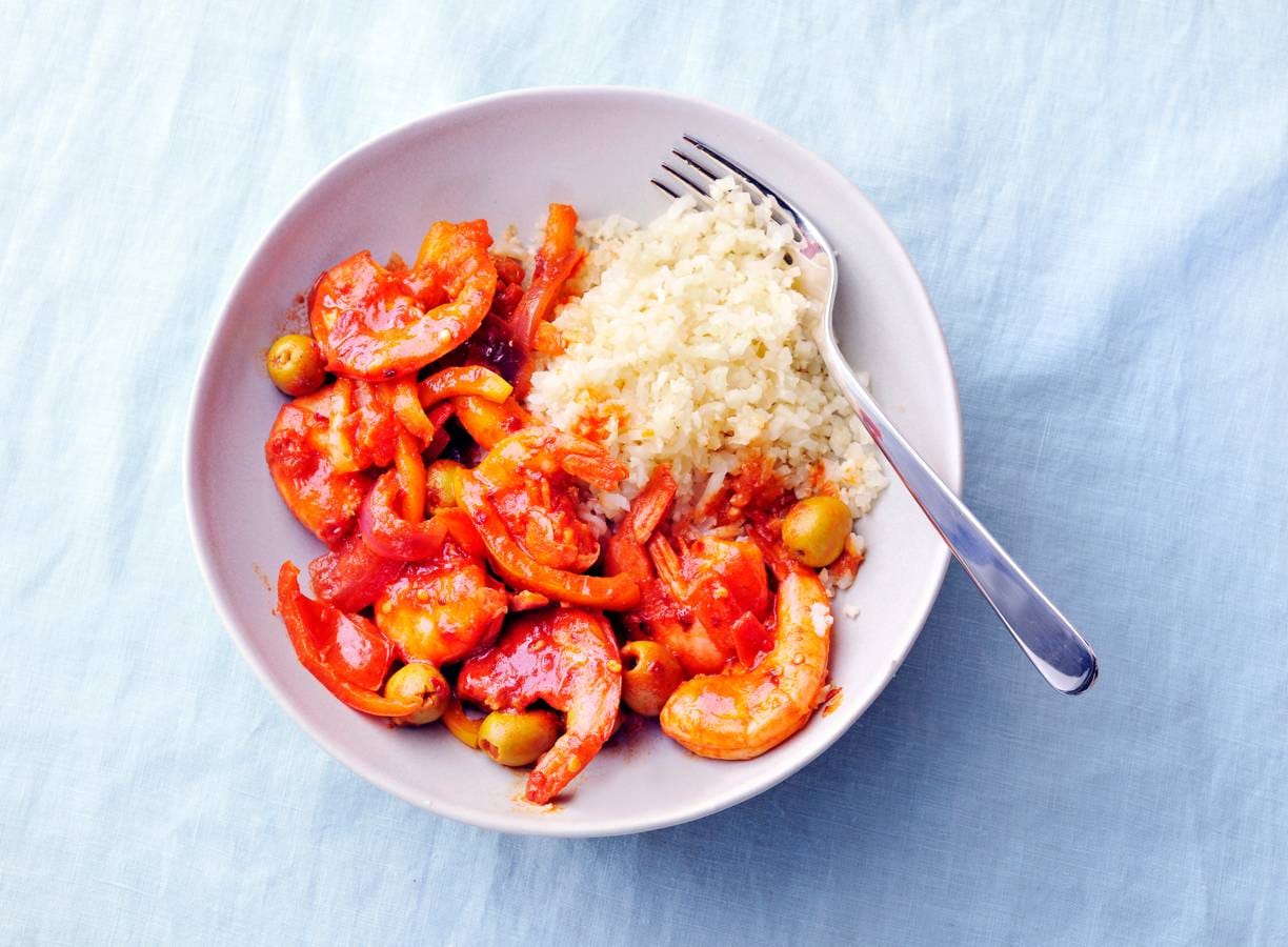 Schenk het water erbij en laat met de deksel op de pan 10 min. stoven. Voeg na 5 min. de garnalen en olijven toe.