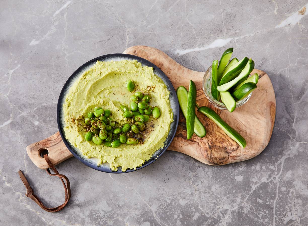 Dop de rest van de tuinbonen. Snijd de komkommers in de lengte in vieren. Schep de hummus op een plat bord, bestrooi met de gedopte tuinbonen, za’atar en besprenkel met de rest van de olie. Serveer de komkommers ernaast.
