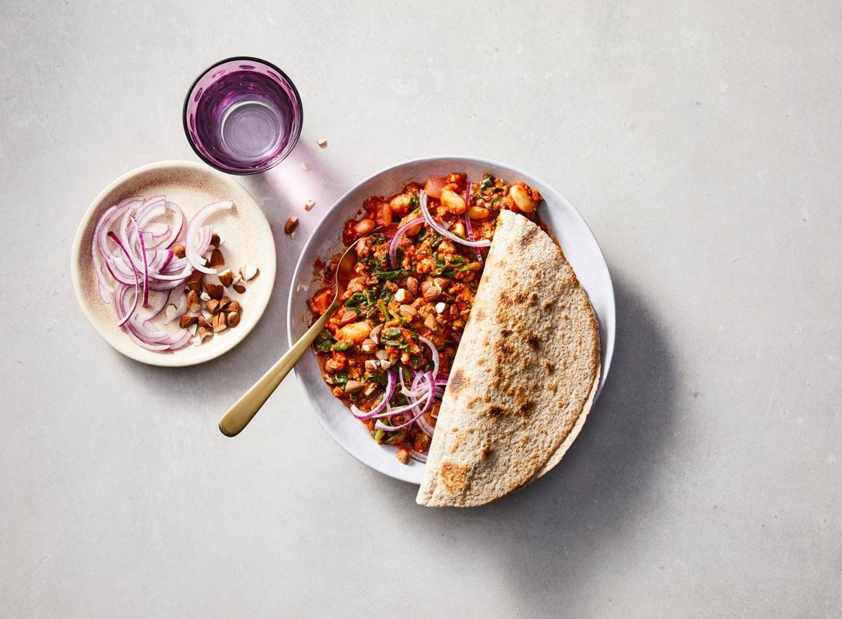 Verwarm de tortilla’s volgens de aanwijzingen op de verpakking. Hak de achtergehouden amandelen grof. Schep de bonenstoof in 4 diepe borden. Garneer met de gehakte amandelen en halve uiringen. Serveer de stoof met de wraps ernaast.