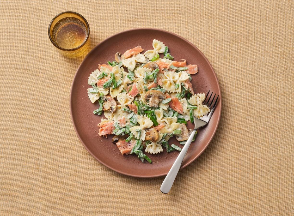Dep ondertussen de ontdooide zalm droog en pluk de rauwe zalm in flakes. Voeg de zalmflakes en zuivelspread toe aan de champignons en verwarm 1-2 min. mee op middelhoog vuur. Voeg de pasta, snijbonen en wat kookvocht toe en schep om. Breng op smaak met versgemalen zwarte peper en eventueel zout.