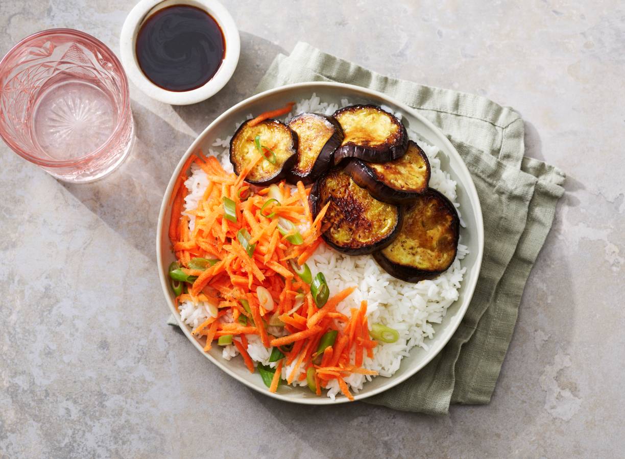 Budgetbowl? Dat is deze rijstbowl met soja-aubergine en wortelsalade. Dubbel geluk: hij is nog vegan ook!