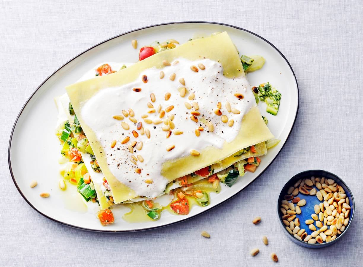 Open lasagne met pesto, ricotta, Italiaanse roerbakgroente en pijnboompitten
