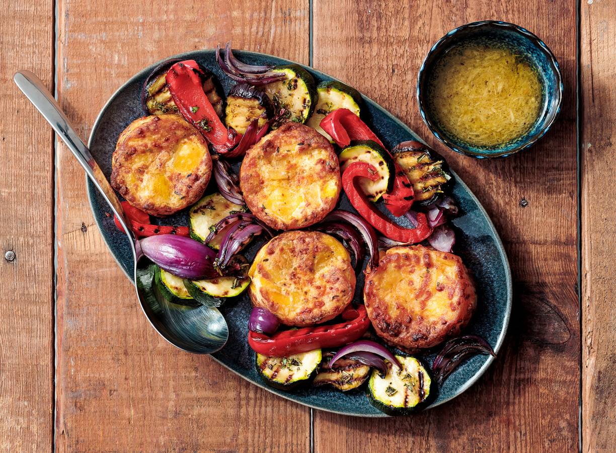 Vet de grillschaal in met wat olijfolie, leg de gratins erin en verwarm 20 min. op de barbecue. Rooster de laatste 8 min. de groenten op de barbecue, keer halverwege. Verdeel de groenten over de borden, leg een gratin in het midden van elk bord.