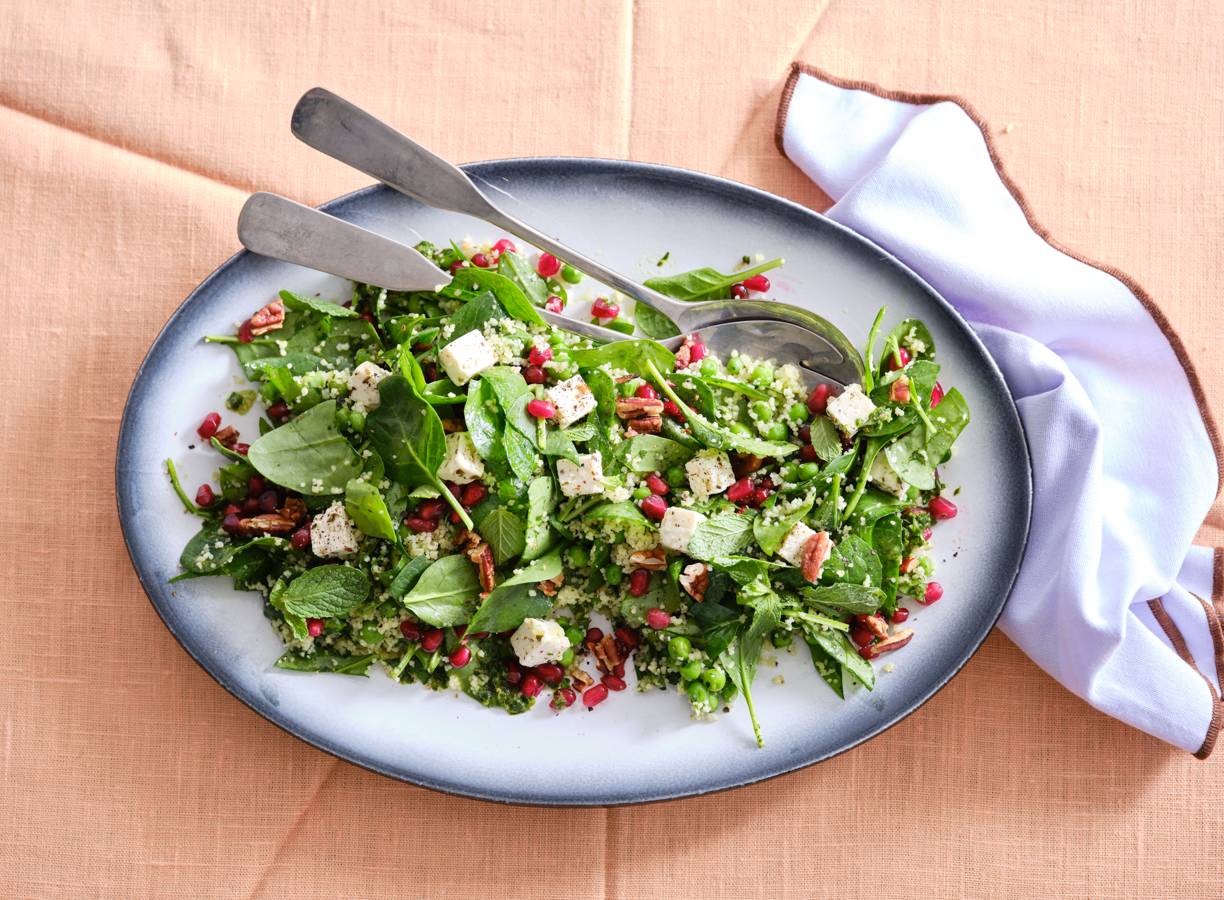 De lente vraagt om couscoussalade. Met spinazie en groene kruiden maak je er het perfecte voorjaarsbordje van.