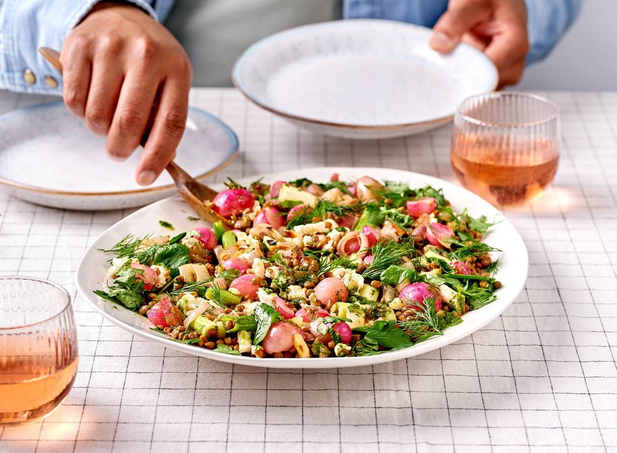 Meng in een grote kom de linzen met de dressing. Verdeel over een schaal en verdeel de geroosterde groenten erover. Bestrooi met de rest van de dille en de rest van de peterselie.
