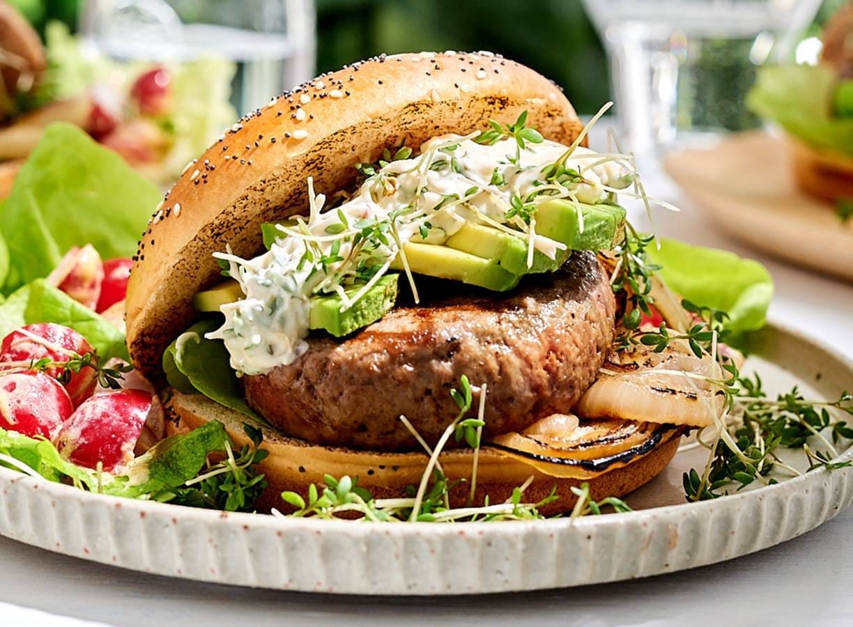 Een runderburger met romige avocado, pittige tuinkers en een knapperig broodje.