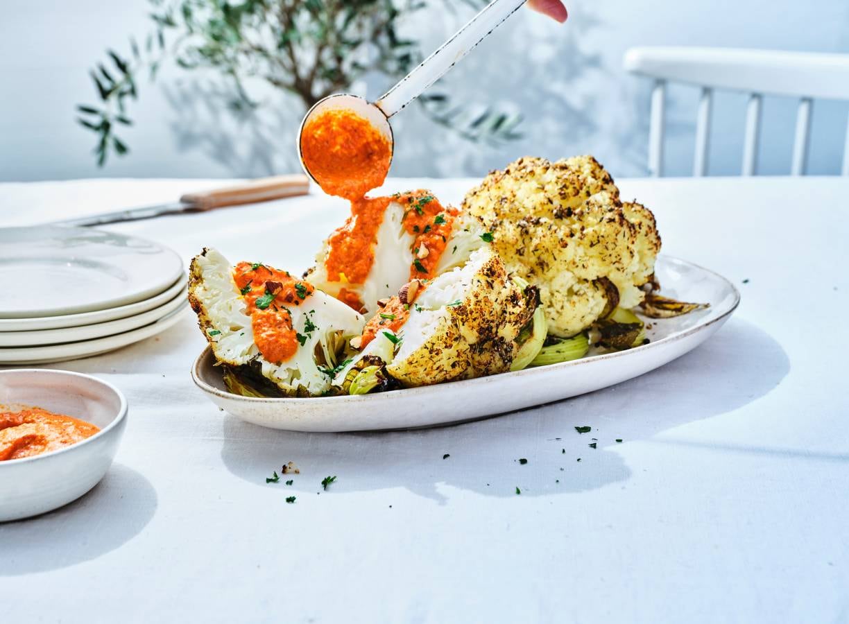 Deze romescosaus met gepofte paprika wil je hierna met nog veel meer eten dan alleen deze bloemkool!