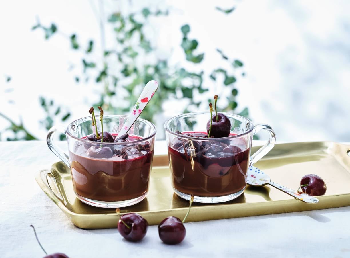 Een romige chocoladecrème met een friszoete saus van verse kersen.