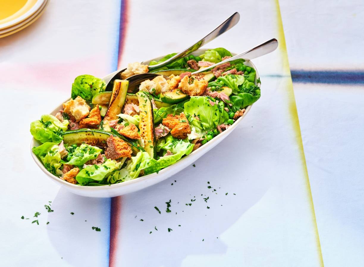 Doe de kropsla met de doperwten en de helft van de kruiden in een kom. Meng de dressing en tonijn erdoor. Schep de salade op een schaal en verdeel er de courgette over. Bestrooi met de overgebleven kruiden en peper. Verdeel de croutons erover en serveer meteen.