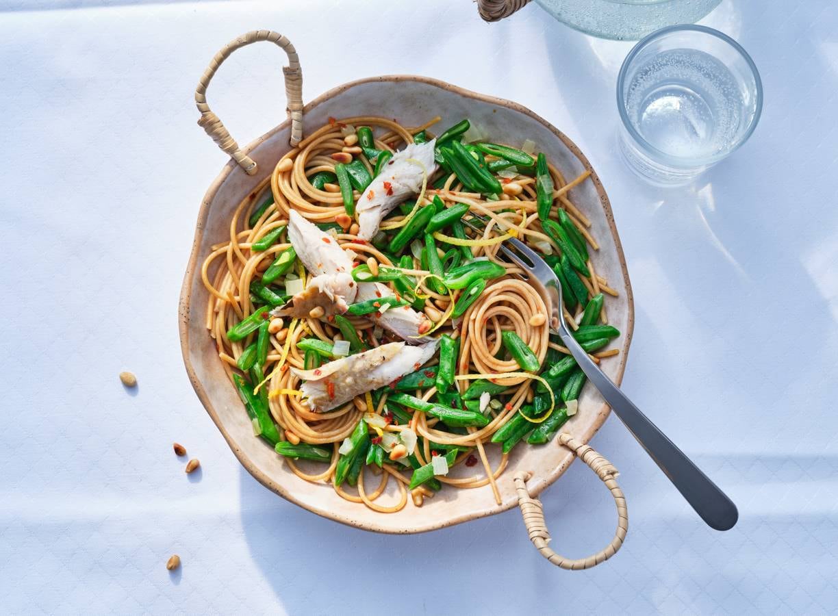 Een zonnige spaghetti met beetgare snijbonen en zachte gerookte makreel.