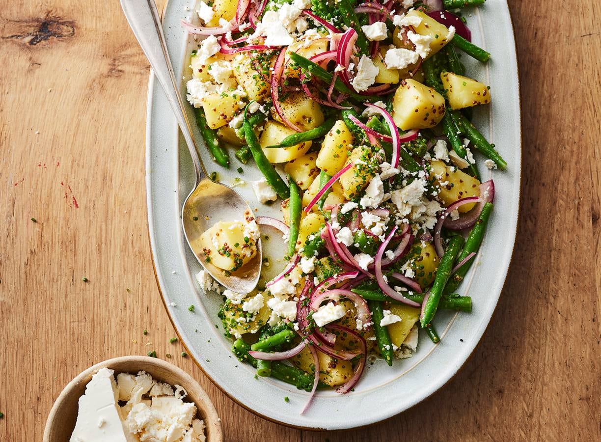 Van aardappels maak je natuurlijk aardappelsalade! Lauwwarm met mosterddressing en witte kaas is deze salade op z'n best.