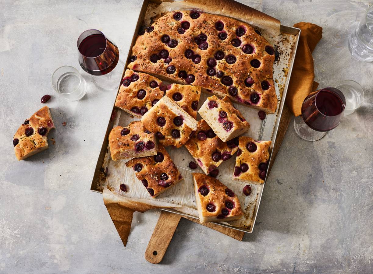 Vul de deukjes van deze focaccia met rode druiven en je hebt een heerlijk brood voor bij een kaasplank. Borrelen maar!