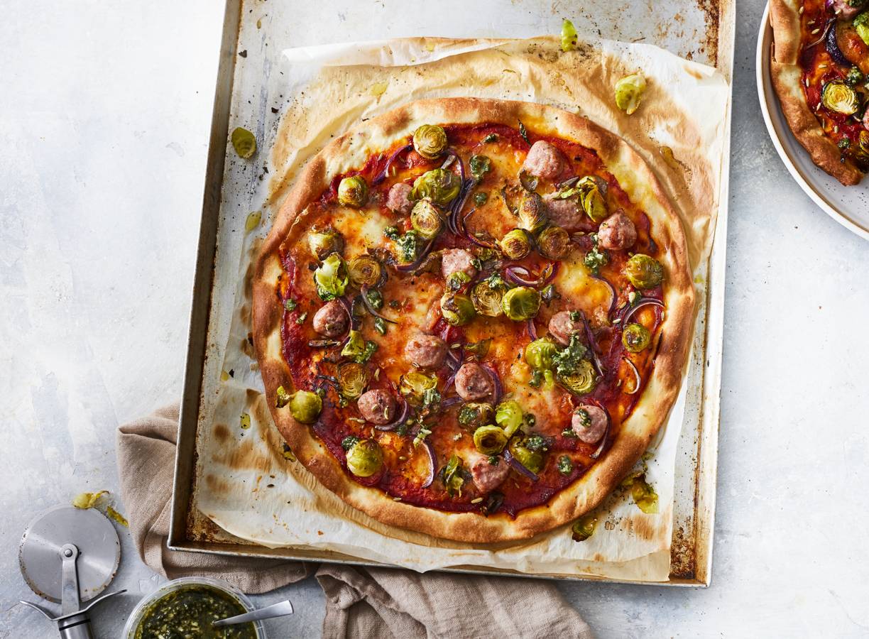 Pizza met spruitjes, worst en rode ui