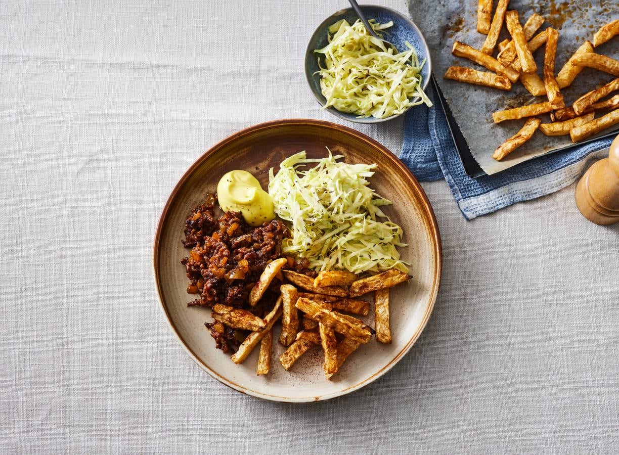 Kruidig rundergehakt met friet van knolselderij: over comfortfood gesproken! De crunchy salade van witte kool is er heerlijk fris bij.