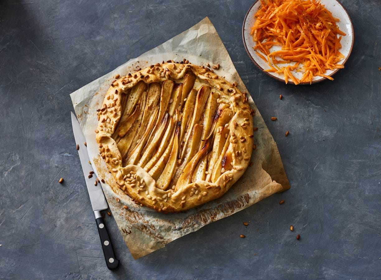 Galette met pastinaak, pijnboompitten en winterpeensalade