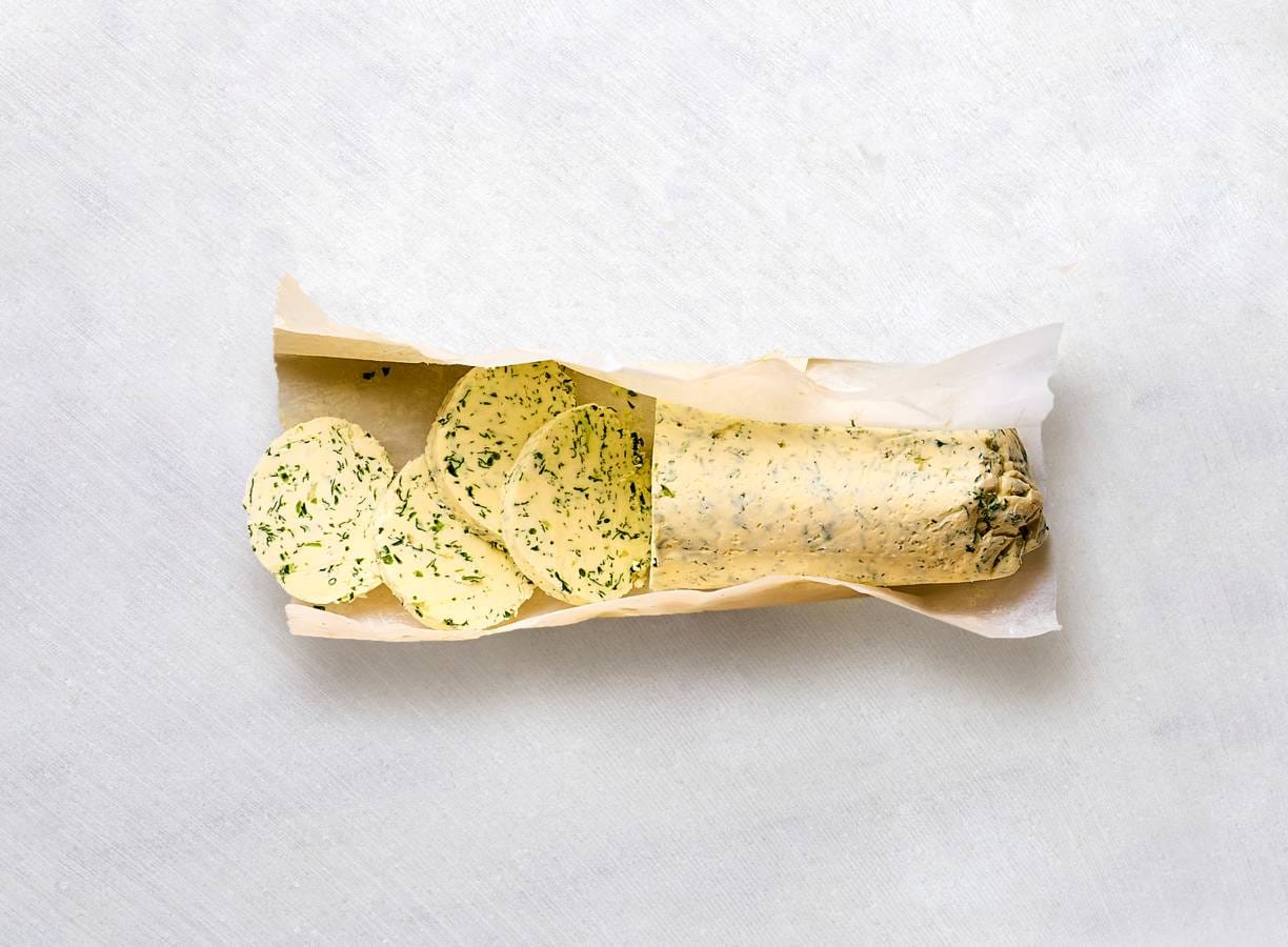 Leg daarna de boter in het midden van een stuk bakpapier. Rol het eromheen en draai de uiteinden in tegengestelde richting dicht, zodat je een worstje krijgt.
