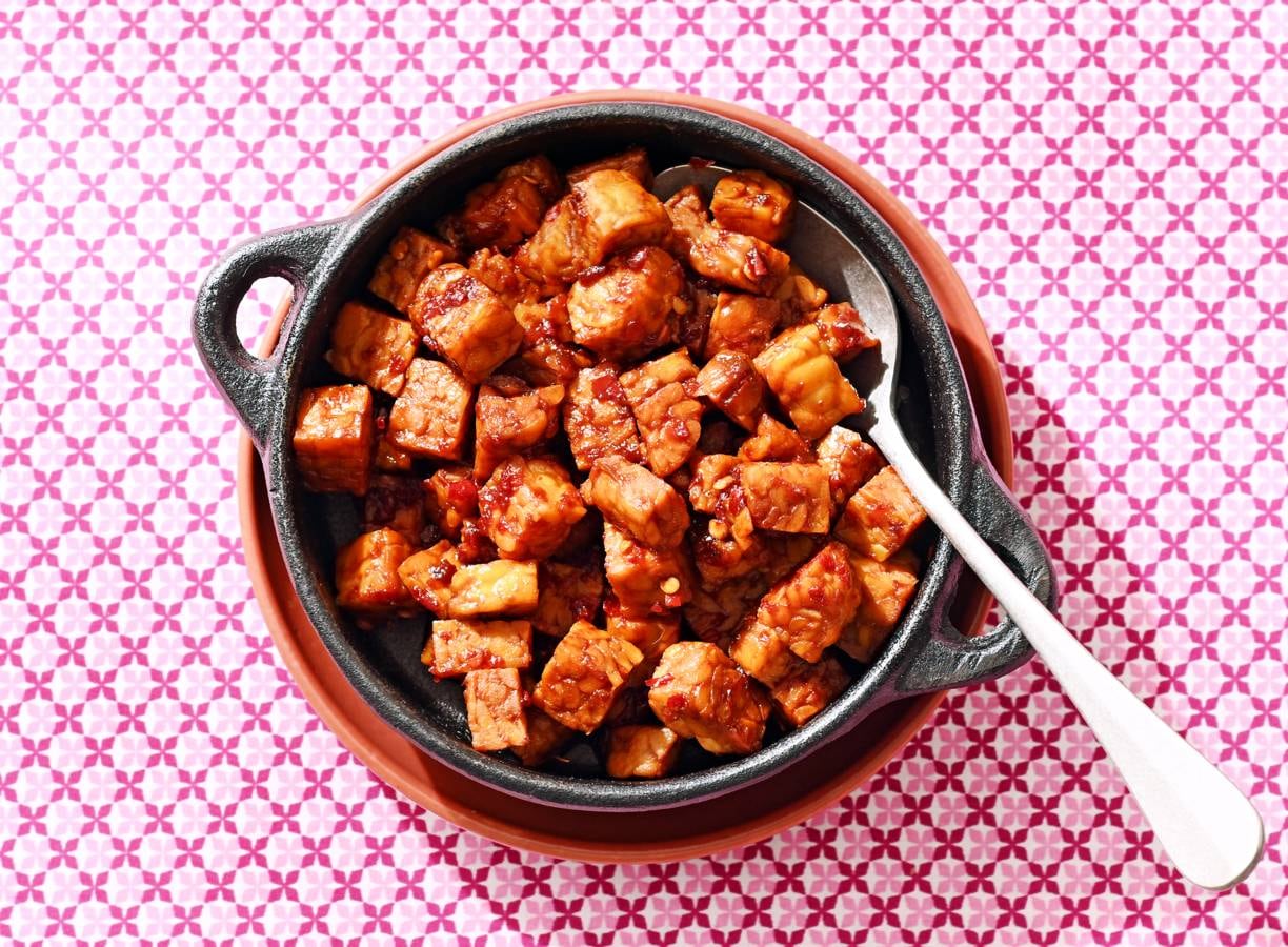 Tempeh in een zoet-pittige sticky saus van sambal en ketjap: zie daar maar eens van af te blijven. Lekker als onderdeel van een rijsttafel, of zo, met jasmijnrijst erbij. Dit is Laura's recept, die het weer leerde van haar tante Erna.