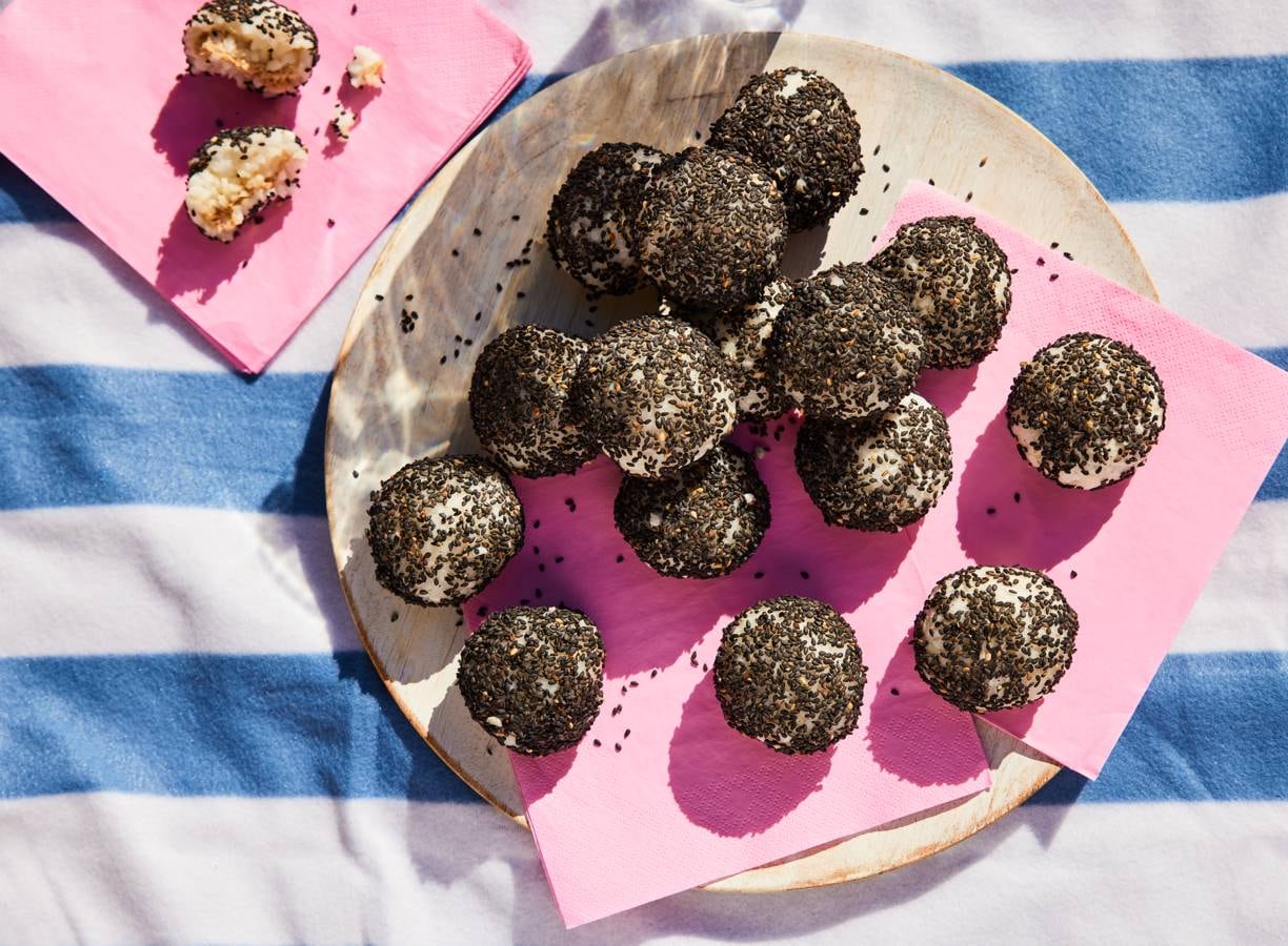 Gaan deze rijstballetjes mee naar de picknick? Rol ze dan stevig op in vershoudfolie en neem ze mee in een koelbox.