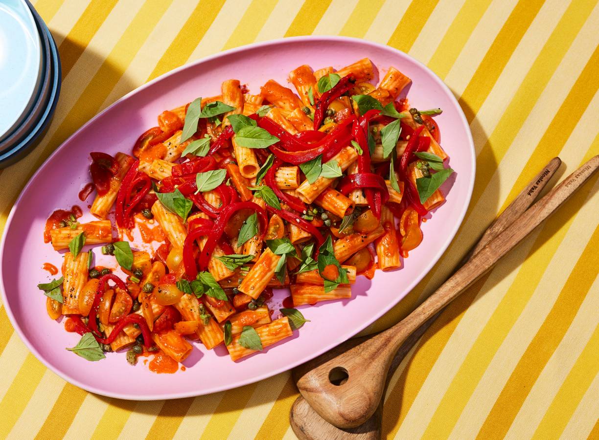 Meng de pasta met de paprikasaus, tomaten en het kappertjes-basilicum- mengsel. Schep de salade op een grote schaal en verdeel de rest van de paprika en het basilicum erover.